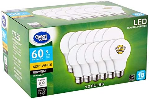 Price: (as of – Details) GREAT VALUE LED 9 WATT SOFT WHITE 12 COUNT Package Dimensions : 7.6 x 6.81 x 5.12 inches; 15.77 Ounces Item model number