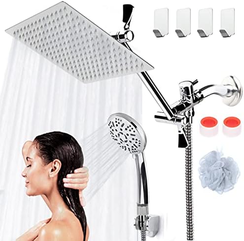Rainfall Shower Heads with Handheld COSYLAND, 10” High Pressure Shower Head Combo with 11” Adjustable Extension Arm 9 Settings Handheld Stainless Steel Dual Shower Heads with 79″ Long Hose, Chrome